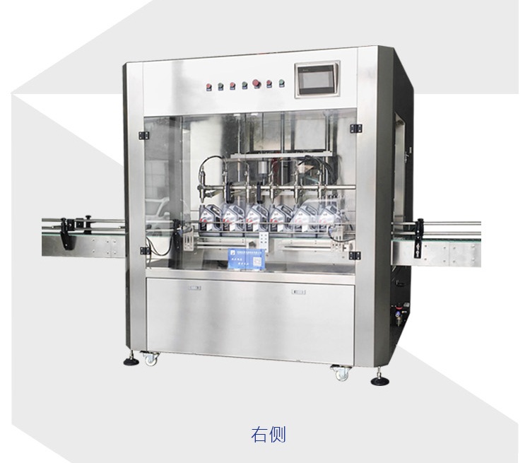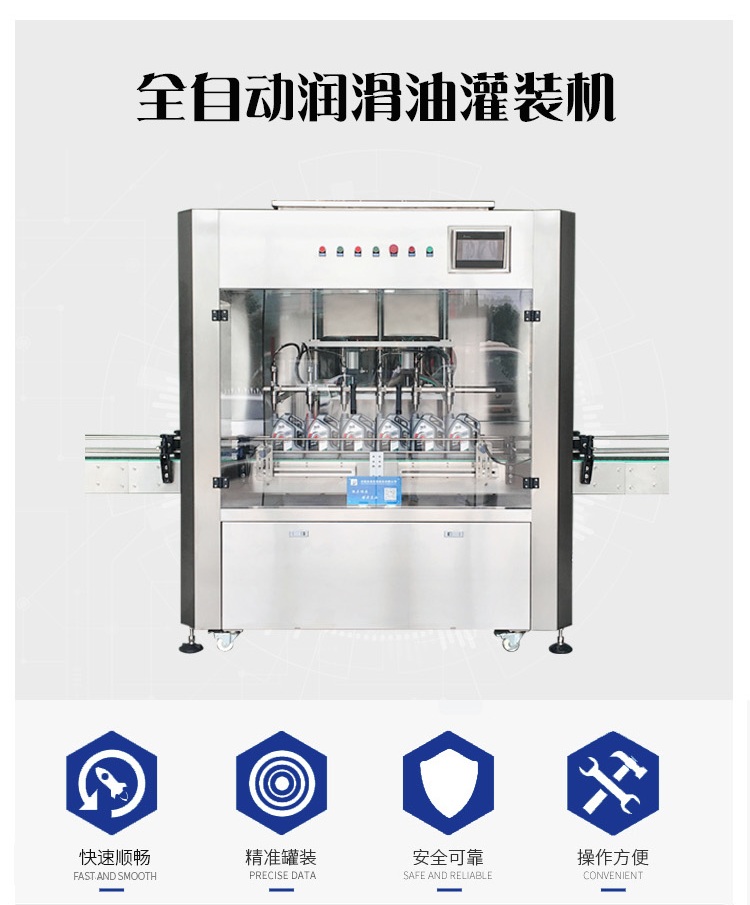 該六頭柱塞式全自動(dòng)潤滑油灌裝機(jī)獨(dú)特的灌裝頭設(shè)計(jì)及真空回吸系統(tǒng),確保灌裝過程無殘油滴漏,快慢雙速灌裝,灌裝速度可調(diào),杜絕溢瓶現(xiàn)象。