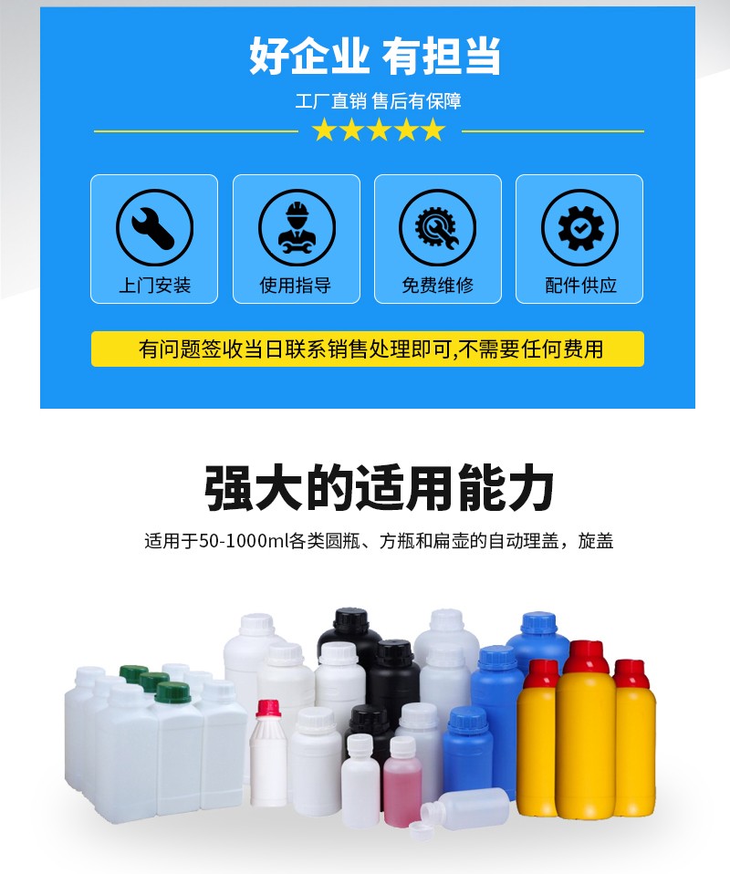 1、通用性強(qiáng):適用于50-1000ml各類(lèi)圓瓶、方瓶和扁壺的自動(dòng)理蓋,旋蓋;