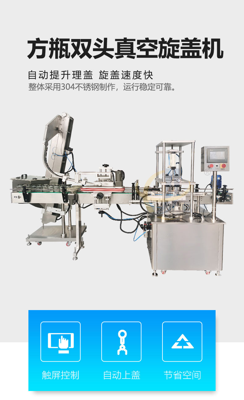 方瓶雙頭真空旋蓋機獨特的設(shè)計,可兼容多種不同形狀,尺寸的瓶子旋蓋,兼容性強,且調(diào)整方便;真空壓力可調(diào),觸摸屏人機界面操作簡單方便。