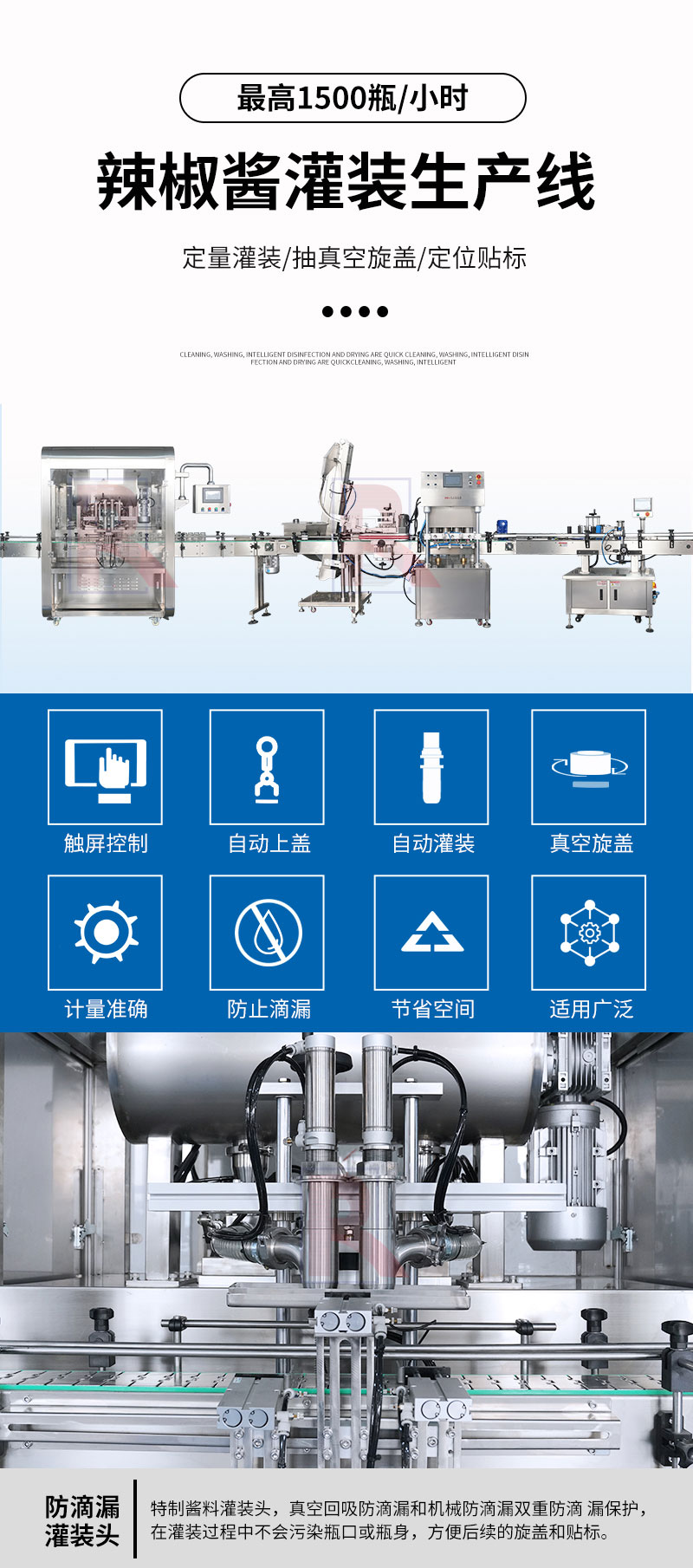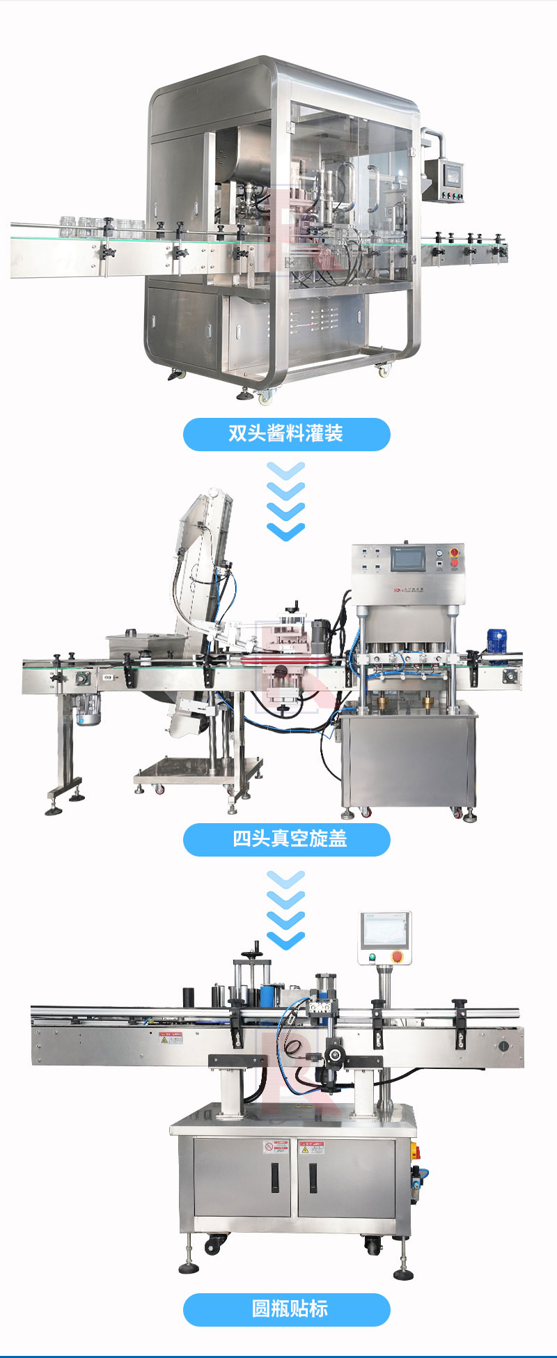 雙頭辣椒醬灌裝生產(chǎn)線適用于調味品中帶顆粒并且濃度較大的香菇醬、豆瓣醬、花生醬、芝麻醬、果醬、牛油火鍋底料等醬類的灌裝。