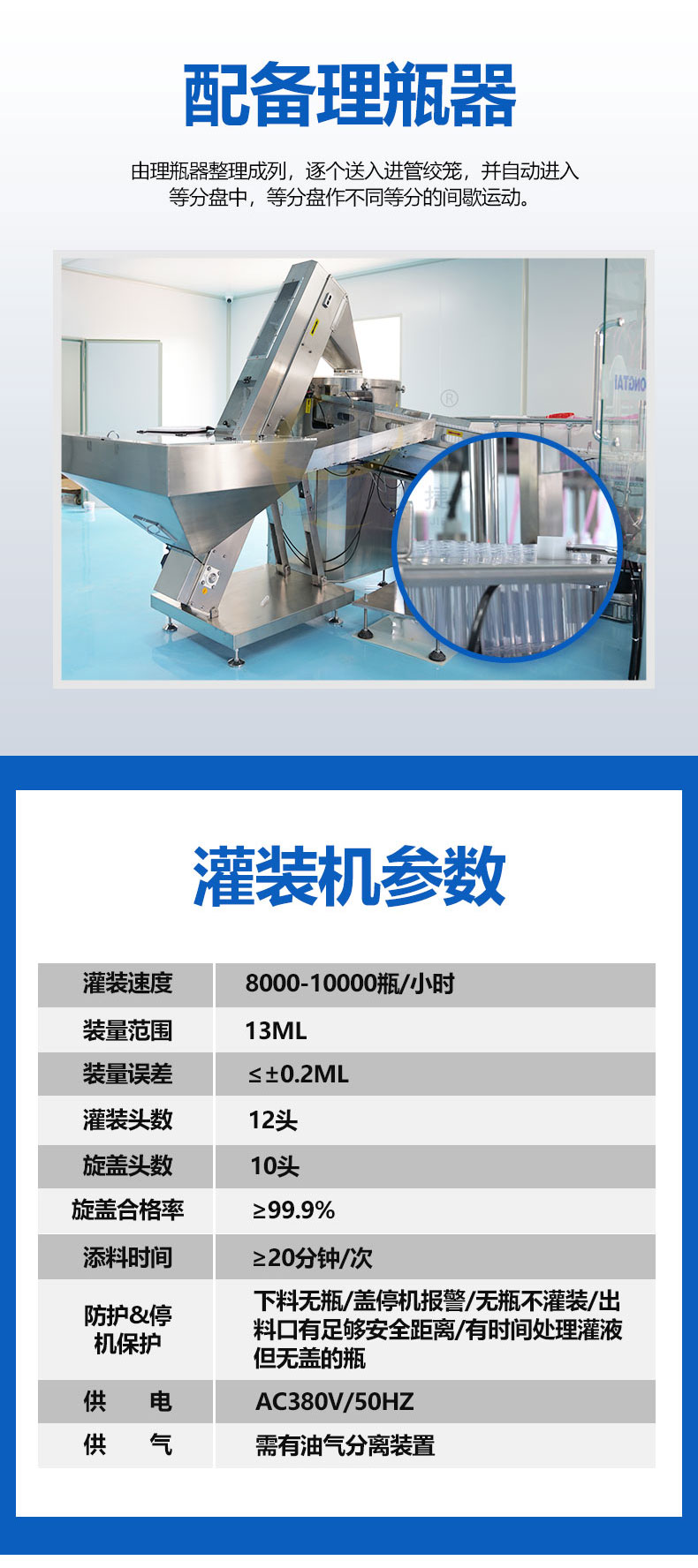 全自動診斷試劑灌裝旋蓋生產(chǎn)線由理瓶器整理成列,逐個送入進管絞龍,并自動進入等分盤中,等分盤作不同等分的間歇運動。