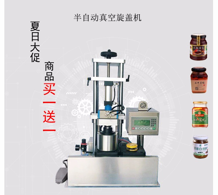 這款小型辣椒醬封口機(jī)主要用于食品包裝,采用標(biāo)準(zhǔn)馬口鐵爪式旋開蓋封口的玻璃瓶包裝。可實現(xiàn)的功能是抽吸包裝容器內(nèi)的空氣使其達(dá)到設(shè)定的負(fù)壓值(即抽真空),然后旋緊蓋子。 為半自動機(jī)型,即人工進(jìn)出瓶,人工配蓋,其他過程自動。