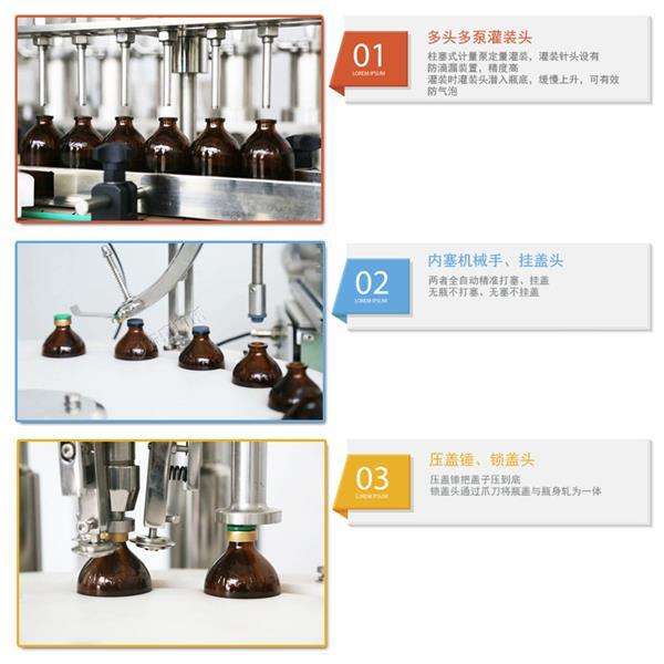 2.     穩定精準快速:柱塞式計量泵定量灌裝,灌裝針頭設有防滴漏裝置,精度高。每分鐘可灌裝40-60瓶。