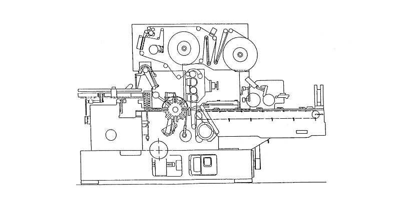 (二)機械傳動   401型小包薄膜包裝機由立勵磁的直流分路繞線式電機提供驅(qū)動力。主電機 (2)通過定時皮帶 (3)帶動主傳動軸 (1),主傳動軸 (1)將動力分配成5路。     主傳動軸上的齒輪系 (10)傳動軸 (15),軸 (15)通過傘齒輪體 (12)帶動定時皮帶 (11)。定時皮帶 (11)驅(qū)動分離輪 (13)和傳送輪 (14)2路 ,主傳動軸上的錐齒輪副 (8)帶動偏心圓盤 (16)和連桿 (17),拖動行走架 (18)和輸人推送器 (19)作往復(fù)直線運動。
